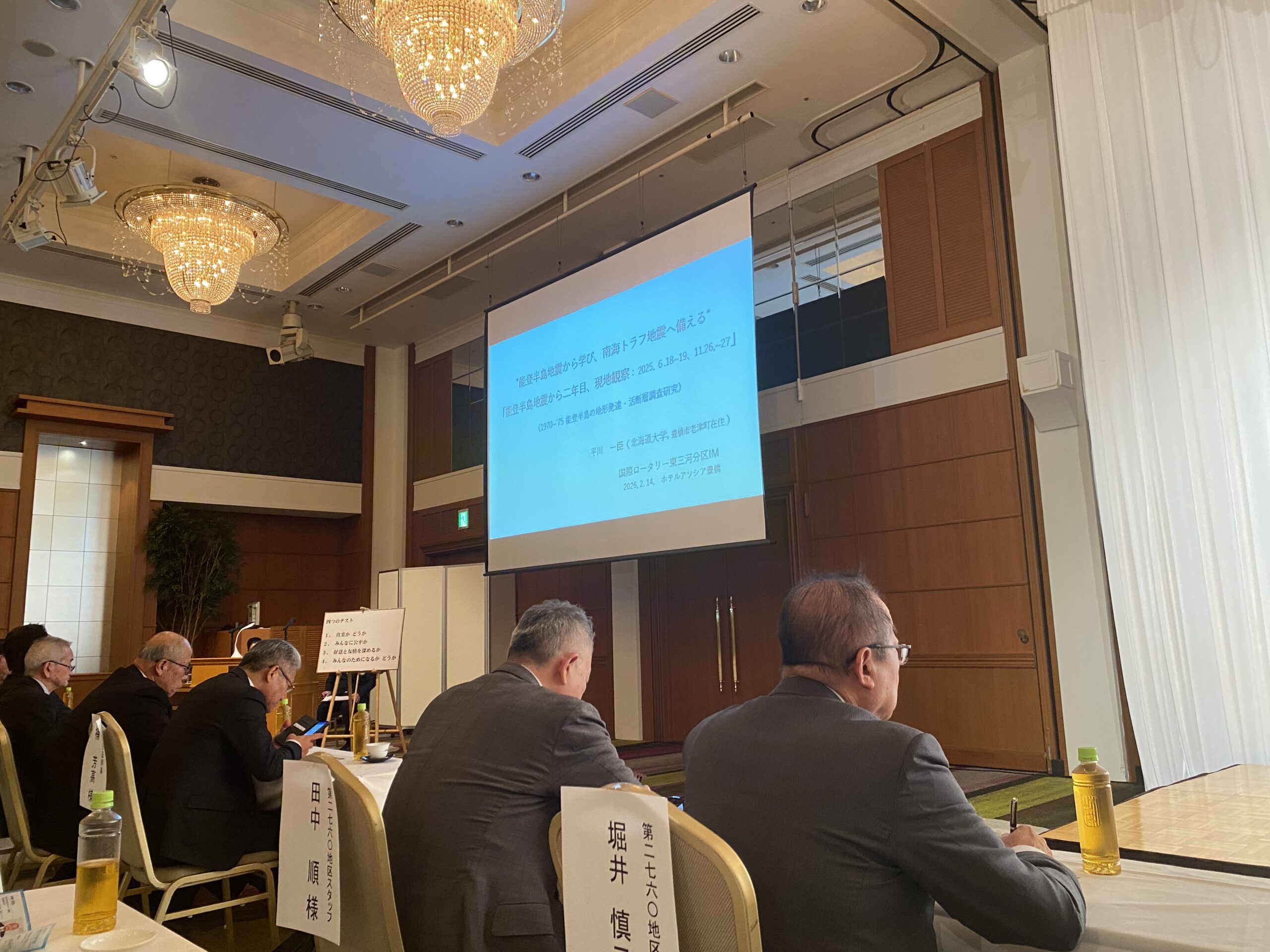 IMテーマ「能登半島地震の経験から学ぶロータリアンが実践する南海トラフ地震への備え」に沿い、北海道大学平川一臣名誉教授から、これまでの5,000年間の当地の地震災害について、能登ロータリークラブ三宅一宏パスト会長からは、2024年1月能登半島地震の実際について、独立行政法人中小企業基盤整備機構中部本部仲保吉正アドバイザーからはリスクへの対処法、BCP・事業継続力強化計画の作成について、経済産業省中部経済産業局産業部経営支援課迎方子課長補佐から全国で発生する自然災害への対処についての卓話をいただき、その後、学識者・行政・当事者ロータリアンとしてそれぞれの立場からのクロストーク、パネルディスカッションがあり、南海トラフ地震を含めた自然災害(地震・風水害)に対する今後の備えについてしっかり理解できる大変有意義な東三河分区会議でありました。